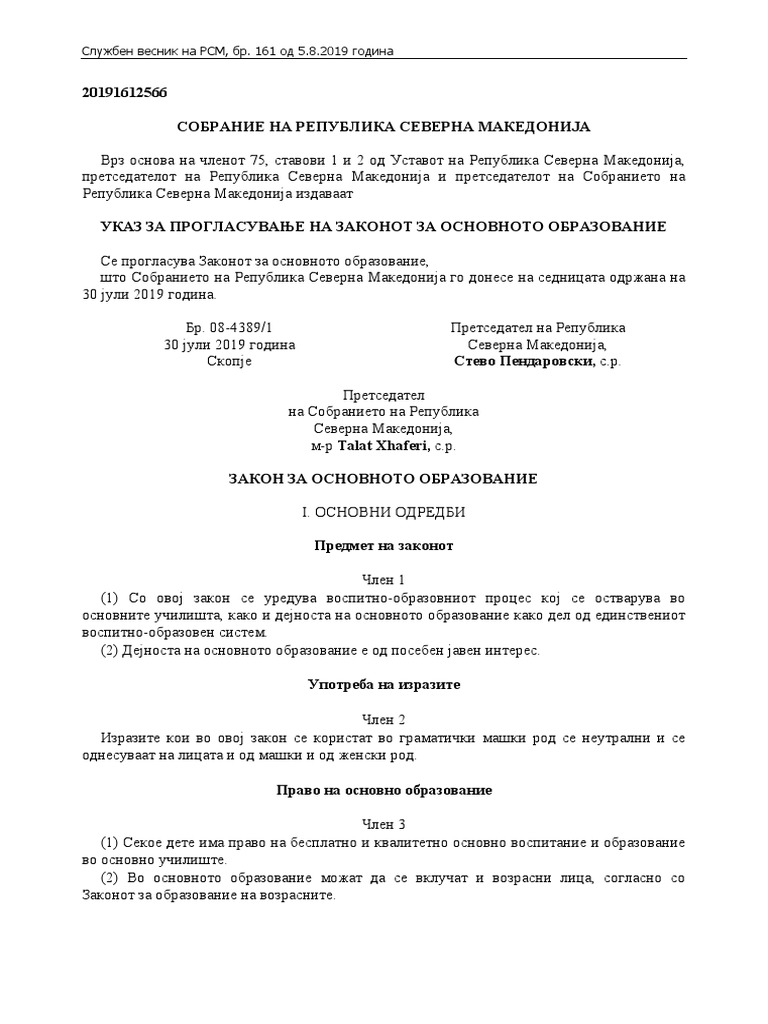 Zakon Za Osnovnoto Obrazovanie Br 161 2019